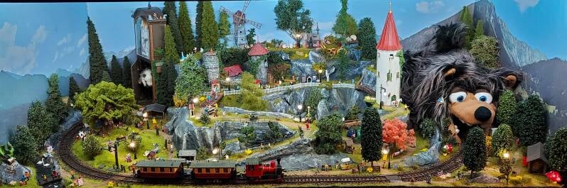 De afmetingen van het diorama zijn 120x60x45cm (breedte x diepte x hoogte). En op het diorama vind je een groot aantal sprookjes en sprookjesfiguren uitgebeeld. Hieronder vind je alle sprookjes die op het diorama staan.