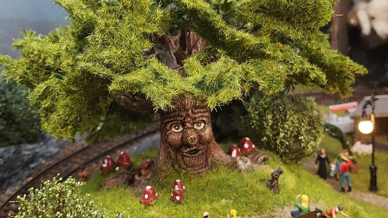 Aangezien het diorama een soort van miniatuur Efteling sprookjesbos moet worden heb ik natuurlijk ook een sprookjesboom toegevoegd aan het diorama. Bij een site voor kerst dorp decoratie spullen vond ik het ideale boompje dat redelijk goed past bij het h0 formaat. Ik heb alleen de voet van het beeldje begrast met de grasmaster om het mooier te maken. orgineel zat er hard kunststof gras op dat donkergroen geverfd was.