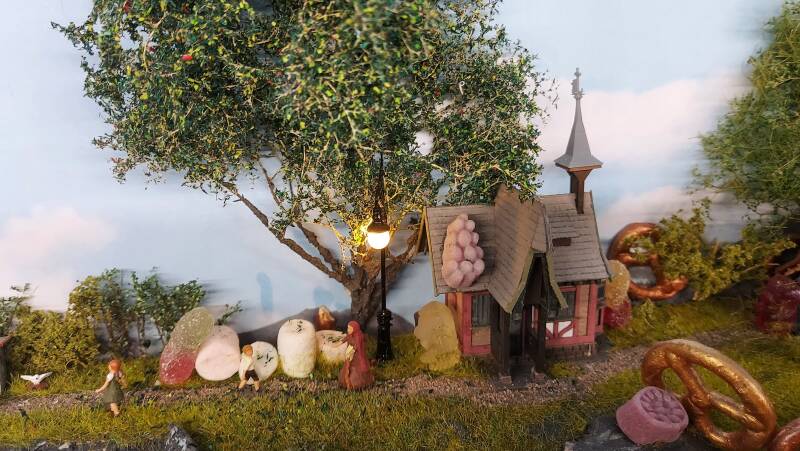 Na een paar maanden is het geld voor eten weer op en weet de stiefmoeder de houthakker weer over te halen zijn kinderen in het bos achter te laten. Ook deze keer hoort Hans dit en wil hij kiezels verzamelen. De stiefmoeder heeft dat echter door en houdt de deur op slot. Daarop besluit Hans broodkruimels te strooien. Als ze echter die nacht terug naar huis willen blijkt het brood opgegeten door vogels. Ze kunnen dus niet naar huis terug. Na drie dagen zwerven komen ze, met de hulp van een vogeltje, een huisje tegen gemaakt van allemaal lekkere dingen. Hans en Grietje eten er lekker van en worden zelfs binnengelokt en krijgen melk en pannekoeken. Het huisje blijkt van de heks. Zij sluit Hans op om hem vet te mesten en op te eten. Grietje wordt haar slaaf en moet alle huishoudelijke klusjes doen.